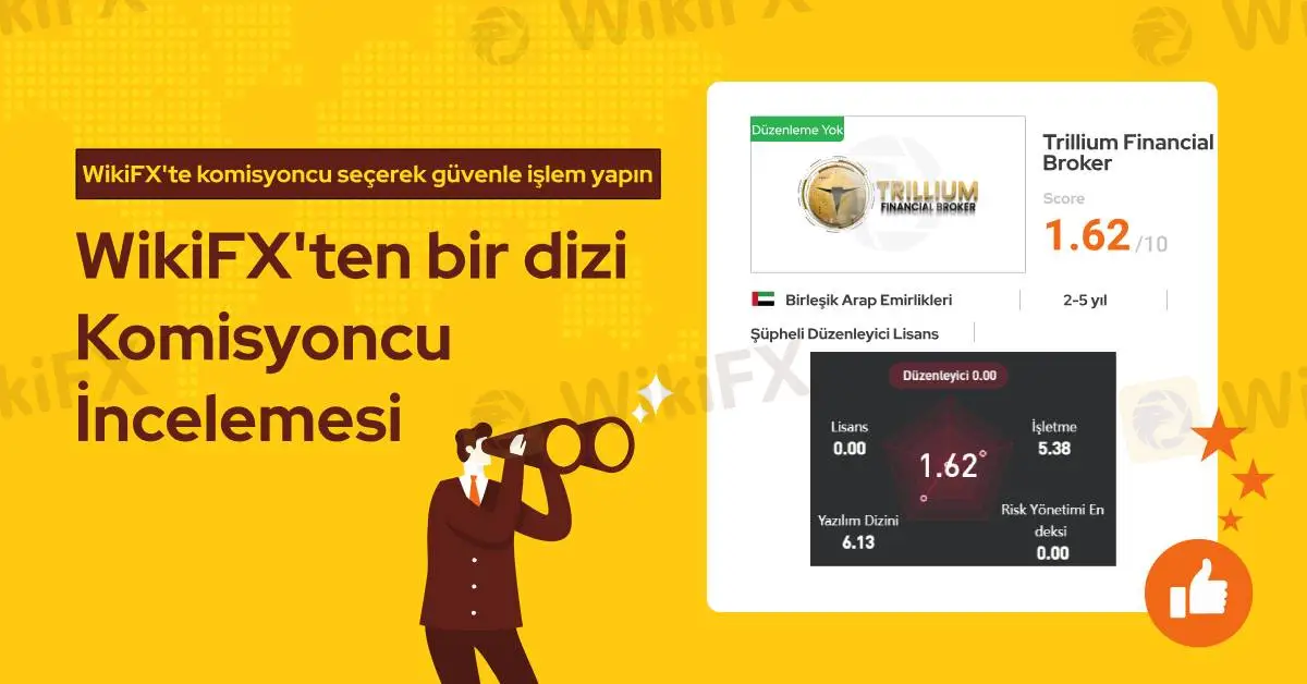 Trillium Financial Broker resmi lisans sahibi bir forex komisyoncusu değildir ve WikiFX araştırmalarına göre bu firmanın lisansı geçerli değildir. Ayrıca bu firmayla ilgili olarak son 3 ayda 27 farklı şikayet WikiFX yetkililerine ulaşmıştır. Bundan dolayı WikiFX bu komisyoncuya 1.62/10 gibi düşük seviye bir puan vermiştir.