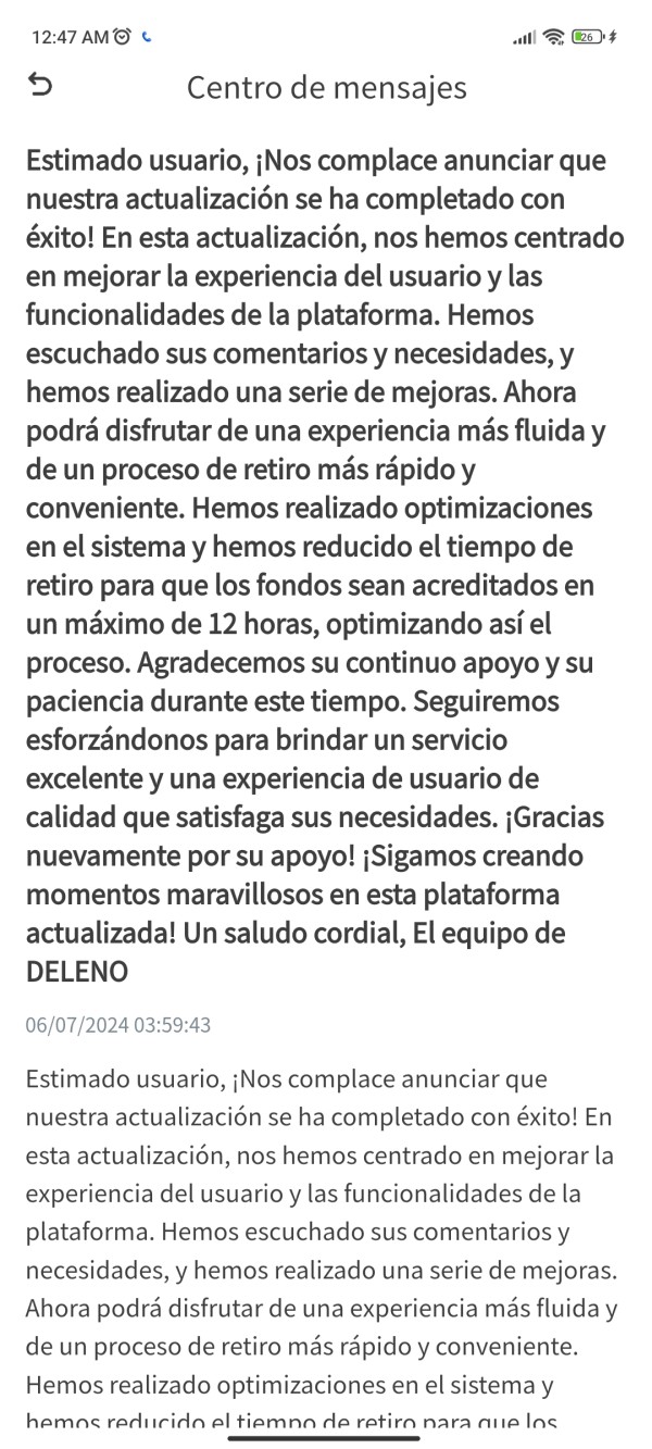 Hice un retiro de mi capital y ganancias en DELENO IFC y no me llegaron hicieron una actualización nueva y dice que en máximo 12 horas tiene que llegar y aún nada me llegó un depósito del 100% de lo que tenía y no lo toque sigue en la cuenta solo retire mi capital y mis ganancias operadas necesito una pronta solución ya que no soy el único afectado en esto gracias...