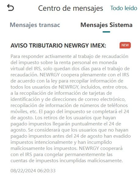La plataforma de Newrgy Imex no me deja retirar mi dinero porque está cobrando el 20% de impuestos adelantado y me está amenazando con bloquear mi cuenta si no pago está cantidad antes del 24 de agosto como referencia de este acto,días anteriores bloquearon las cuentas con la excusa de una auditoría que iniciaba el 6 de agosto y que finalizaría el 16 de agosto del 2024 para que supuestamente pueda cotizar en la bolsa de valores de Estados Unidos