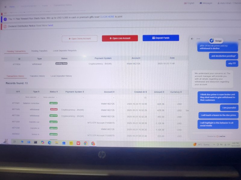 Hello, I am Abdul Ahad. I am an experienced forex trader. My withdrawal id 4671549 amount 678.38$ was declined after 24 hrs. wait doo prime support said my withdrawal will be available after pending deduction .After some time my all amount 628.38 is deducted from my account without any notification and only 50$ remaining in my account. I contact several times to their live support and even sent many emails at en.support dooprime.com but there is no response from Dooprime. Dooprime is totally scam broker .please beware of this fraud broker. They will never give you withdrawals .they only want deposit from us. I am really worried about my withdrawal. So please someone help me with this matter and I need my amount 628.38$ back from dooprime .doo prime about my withdrawal amount 628.38 $ deducted from my wallet without any Abdul Ahad Do prime Client id 1784049