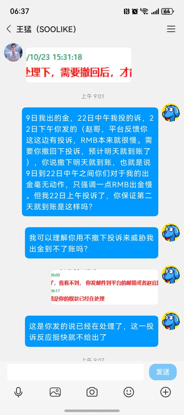 9日出金22还没到,我投诉平台,22日下午业务员说撤了投诉就给出金,还说有问题就赔偿我三倍,今天27号了算不算出问题了呢!