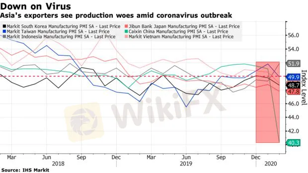 Chỉ số thu mua của Caixin Media và IHS Markit tại Trung Quốc được công bố vào thứ Hai tuần trước, đã giảm xuống 40.3, mức thấp nhất kể từ khi dữ liệu này bắt đầu được ghi nhận vào năm 2004. Chỉ số PMI của Hàn Quốc, một thước đo quan trọng của nhu cầu toàn cầu đã giảm xuống mức thấp nhất trong vòng 4 tháng qua từ 49.8 xuống 48.7 tính từ tháng 1, trong khi đó chỉ số Jibun Bank Japan giảm xuống 47.8, ghi nhận thấp nhất kể từ tháng 5 năm 2016.