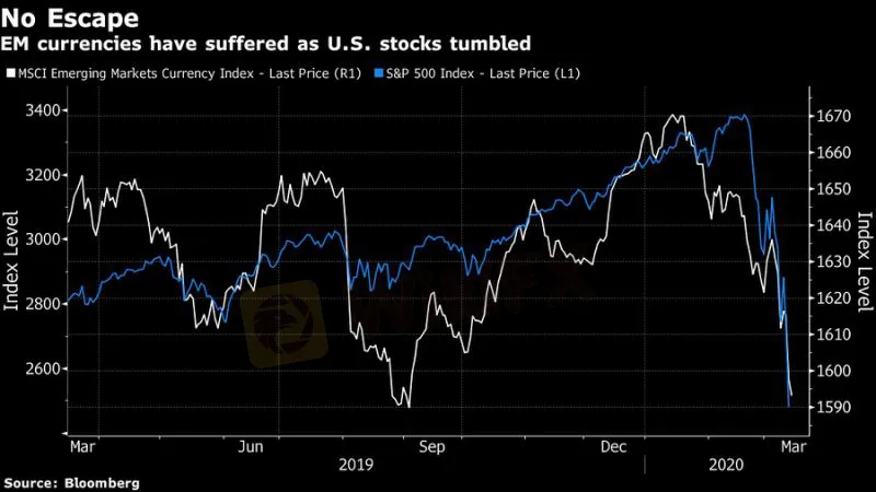 Tiền tệ tại các thị trường mới nổi đang đối mặt với việc bán phá giá tới 30% nếu sự bùng phát của coronavirus khiến cổ phiếu Mỹ trượt dốc không kém so với cuộc khủng hoảng tài chính toàn cầu , phân tích từ Bloomberg.
