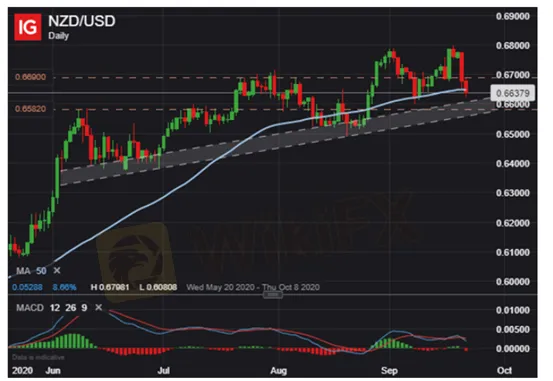 Về mặt kỹ thuật, giá đóng cửa của NZD/USD đã giảm xuống dưới đường trung bình động 50 ngày và sự giao nhau trong xu hướng giảm của chỉ báo MACD cũng cho thấy áp lực giảm giá gia tăng. Trước quyết định của Ngân hàng Trung ương New Zealand, đồng đô la New Zealand có thể phải đối mặt với áp lực bán ra nhiều hơn nữa. Ngoài ra, nếu dữ liệu PMI toàn cầu do IHS Markit công bố gây thất vọng và thúc đẩy tâm lý đề phòng rủi ro, thì tỷ giá NZD/USD dự kiến sẽ giảm nhanh và sâu hơn.