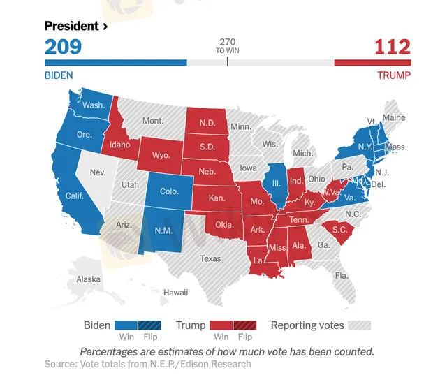 Lời nói đầu:Ông Biden vừa bứt phá khi nâng số phiếu đại cử tri lên 209 phiếu, bỏ xa một quãng so với mức 112 phiếu của ông Trump.