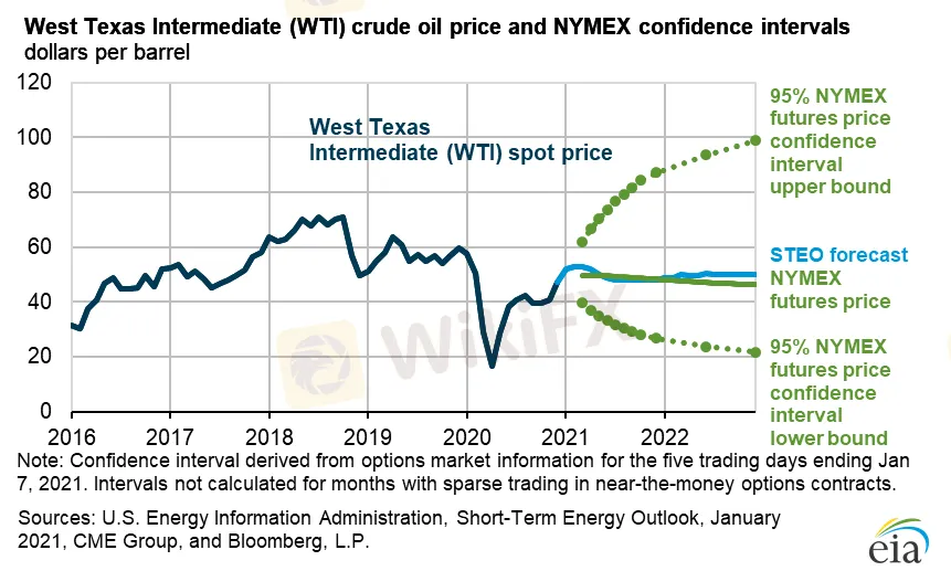 Trong Báo cáo Triển vọng Năng lượng Ngắn hạn (STEO) mới nhất, Cơ quan Thông tin Năng lượng Hoa Kỳ (EIA) đặt dự kiến mức trung bình 49 USD / thùng đối với giá dầu Brent vào năm 2021, cao hơn khoảng 14% so với mức trung bình dự kiến cho quý 4 năm 2020. EIA cho biết rằng dù hiện tại trữ lượng tồn kho dầu vẫn ở mức cao, nhưng như cầu sử dụng năng lượng sẽ tăng lên trong thời gian tới đồng thời các quốc gia sản xuất dầu mỏ và đồng minh (OPEC+) vẫn đang không ngừng cắt giảm sản lượng sản xuất. EIA dự báo giá dầu Brent sẽ trung bình 47 USD / thùng trong quý đầu tiên của năm 2021 và tăng lên mức trung bình 50 USD / thùng vào quý IV.