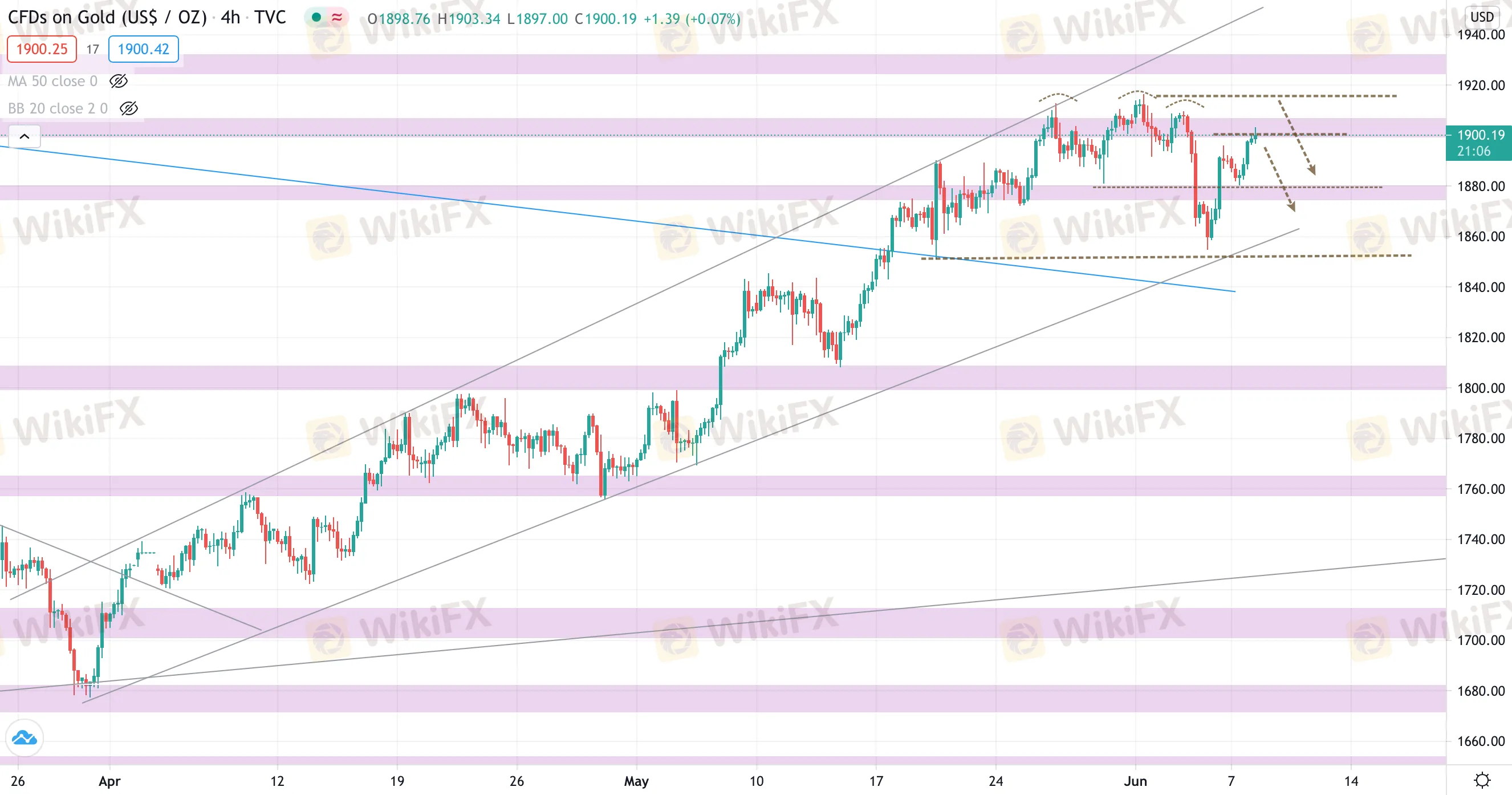 Sau tín hiệu giảm trên H4, giá chỉ giảm nhẹ về vùng 1880 và sau đó bật tăng trở lại, hiện đã tiếp cận vùng cản tâm lý 1900.