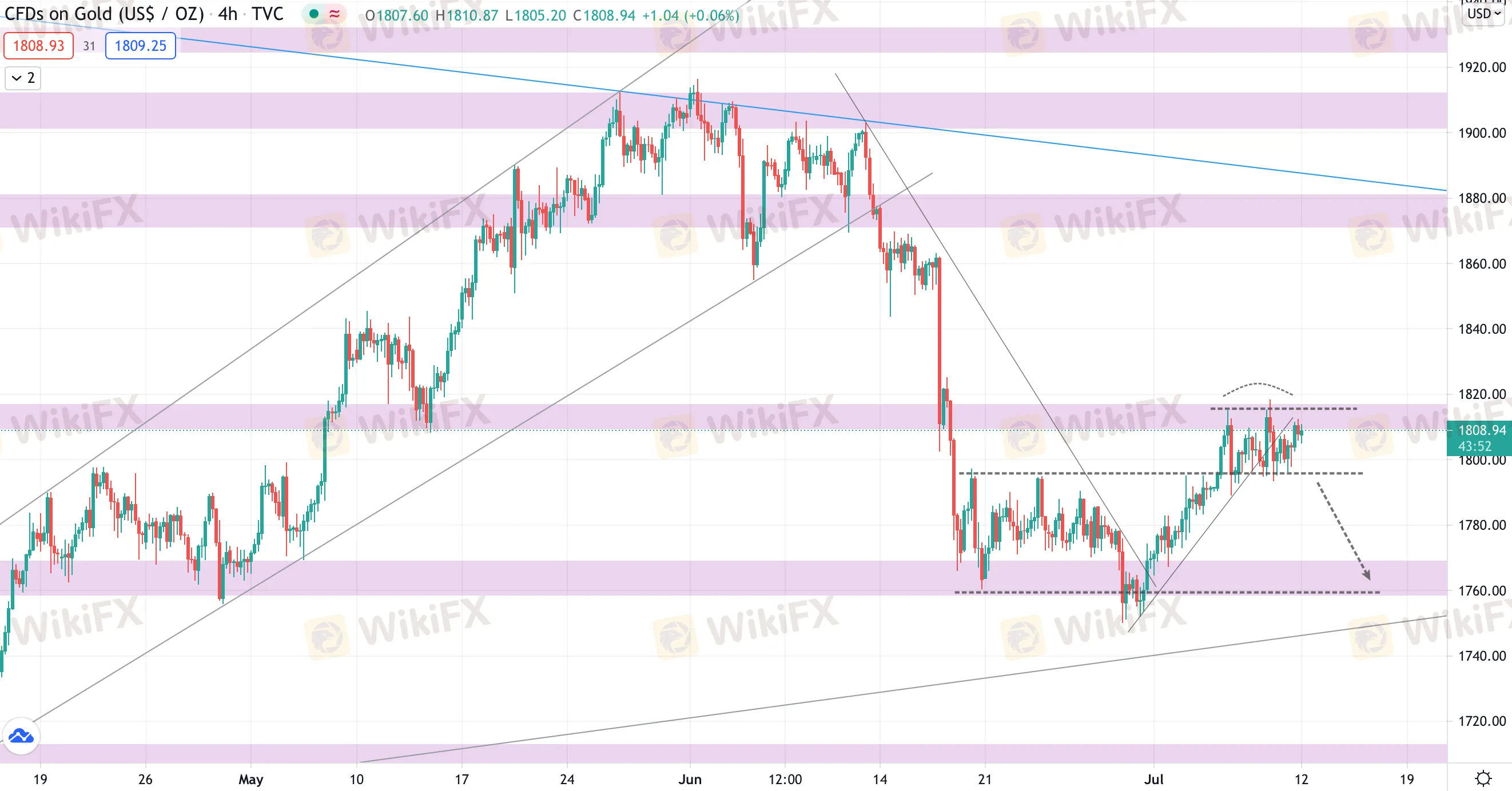 Phiên cuối tuần giá tiếp tục dao động trong vùng tích luỹ, phạm vi từ 1795-1815 mà chưa có dấu hiệu mới đáng chú ý. Các dấu hiệu tạo đỉnh trong ngắn hạn vẫn còn đó, bao gồm: phá đường xu hướng tăng ngắn hạn, mô hình đa đỉnh trên H4, cùng mô hình con xoay (spining top) trên daily. Chúng ta vẫn tiếp tục giữ chiến thuật cũ, duy trì các lệnh bán ra hiện có và bổ sung lệnh mới khi vùng 1795 bị phá xuống dưới.