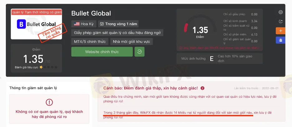 Được giới thiệu là một sàn giao dịch đến từ Mỹ, được thành lập từ năm 2010 có thời gian hoạt động tương đối dài trên thị trường forex. Tuy nhiên, khi WikiFX tìm hiểu kỹ hơn về broker này, chúng tôi phát hiện Bullet Global Investment, còn được cộng đồng trader biết đến với cái tên viết tắt BGI, không hề có giấy phép hay chứng nhận hoạt động kinh doanh từ bất ký cơ quan quản lý nào.