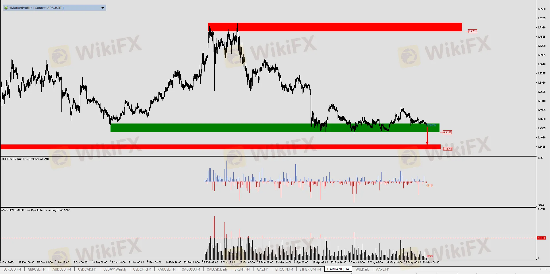 Hãy chú ý đến biểu đồ ADA/USD (Cardano). Loại tiền điện tử này đã được củng cố trong một thời gian dài gần mức nhu cầu quan trọng là 0,4450. Tuy nhiên, với mỗi lần thoát khỏi phạm vi này, sức mạnh của người mua ngày càng yếu đi. Nói một cách đơn giản, đây là một mô hình cổ điển để phá vỡ một mức trên khung thời gian cao hơn và tại thời điểm hình thành xung lực, nó có thể tăng gấp đôi số vốn của bạn.