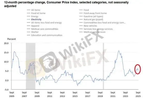 Điện là nhóm chi tiêu thiết yếu và ít co giãn, tương tự chi phí nhiên liệu xe cộ. Khi giá cả tăng cao, điện trở thành nguyên nhân trực tiếp bào mòn thu nhập khả dụng của người tiêu dùng. Theo báo cáo CPI tháng 9 của BEA, giá điện tăng 6,2% YoY trong tháng 8 và 5,1% YoY trong tháng 9, cao gấp đôi tốc độ lạm phát tổng thể.