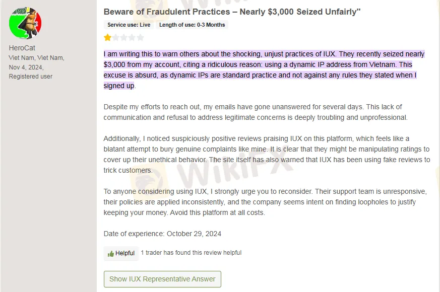 Tài khoản TrustPilot của IUX cũng bị đình chỉ vì nghi ngờ đánh giá giả, được thuê từ các công ty marketing để thao túng điểm số. Tác giả kết luận IUX “liên quan đến cả nhân viên giả và đánh giá giả, và không phải là công ty lâu đời như họ tuyên bố.”