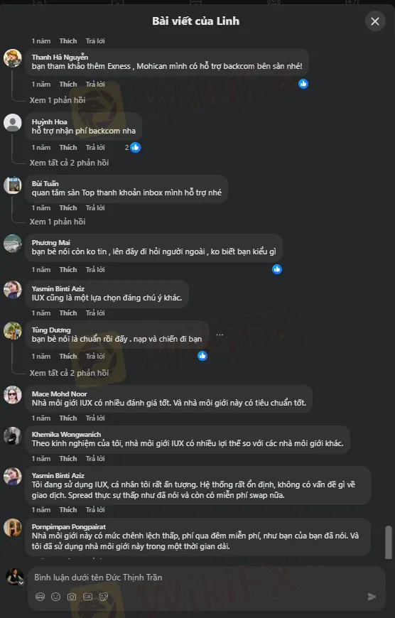 Trên các diễn đàn và nhóm Forex khác tại Việt Nam, tên tuổi IUX vẫn còn rất xa lạ với đa số trader. Một số chủ đề thảo luận về IUX vào năm 2024 nhận được phản hồi tiêu cực, bị gọi là “scam” (lừa đảo) với cáo buộc tài khoản bị “xóa sổ”, cơ chế hút tiền có lợi cho IB bất chấp thua lỗ của khách hàng.