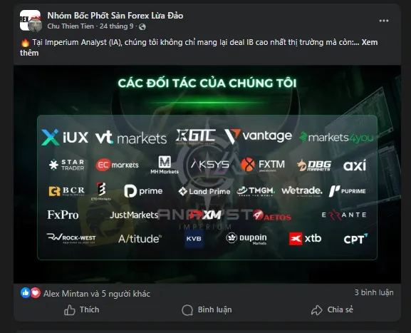 IUX cũng từng hợp tác với một số đơn vị phân tích tại Việt Nam như IA (Imperium Analyst), xuất hiện với tư cách nhà tài trợ. Tuy nhiên, logo của IUX trên banner hợp tác đã biến mất từ khoảng tháng 10/2025, dù lời mời tham dự sự kiện Affiliates Gala Night 2025 tại Malaysia lại được đăng vào tháng 11/2025. Hoạt động xây dựng thương hiệu thông qua các thành viên cấp thấp của IA cũng không tạo được sự tương tác đáng kể nào từ cộng đồng.