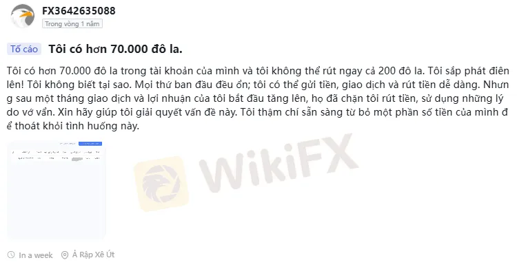 Tại Việt Nam, nhiều người dùng báo cáo delay khớp lệnh, hủy lợi nhuận vô lý, từ chối rút tiền hoặc ép thanh lý vị thế. WikiFX đã hai lần “bóc phốt” sàn vào tháng 08 và 09/2025 với tiêu đề cảnh báo rõ ràng về hành vi chiếm đoạt vốn kéo dài 15 năm. Số lượng tố cáo lên đến hàng trăm, chủ yếu về trì hoãn rút tiền, hủy lệnh thắng và sử dụng bonus làm bẫy.