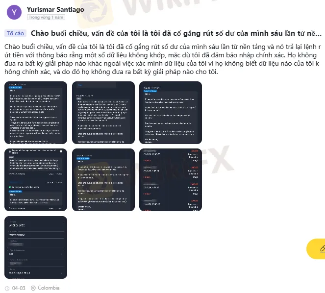 Tố cáo phổ biến nhất là nạp tiền không vào tài khoản hoặc rút tiền bị trả về với lý do “dữ liệu không khớp” mà không có hướng dẫn cụ thể. Một khiếu nại gần đây từ Colombia: người dùng cố rút sáu lần nhưng đều thất bại, nền tảng chỉ yêu cầu kiểm tra dữ liệu mà không giải quyết. Tại Việt Nam, đã có trường hợp trader nạp 100 USD nhưng số dư vẫn hiển thị 0, đây là lần thứ ba gặp vấn đề tương tự. Quotex thường thu hút người mới bằng tài khoản demo và nạp tối thiểu thấp, nhưng khi lợi nhuận tăng hoặc yêu cầu rút tiền, tài khoản dễ bị tạm khóa. WikiFX nhấn mạnh sàn thiếu quy định và có nguy cơ rủi ro cao.