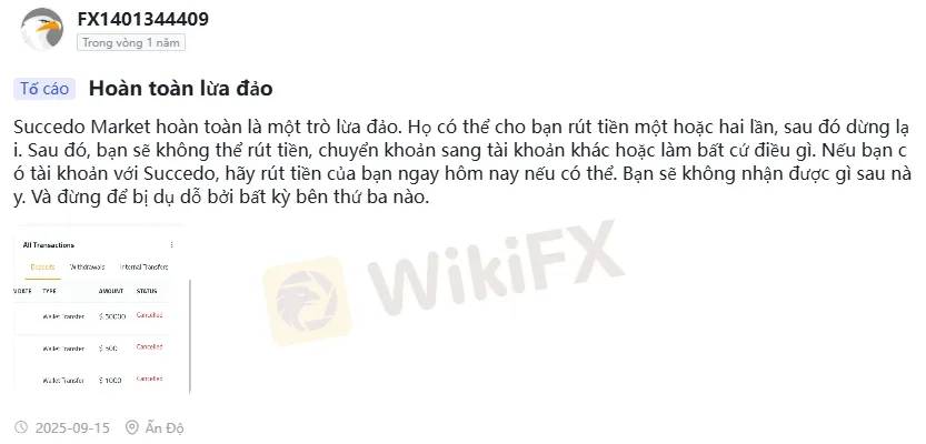 Nhiều trader tố cáo sàn cho phép rút tiền nhỏ ban đầu để tạo lòng tin, sau đó từ chối tất cả yêu cầu rút tiếp theo. Một trường hợp điển hình ngày 15/09/2025: “Succedo Market hoàn toàn là một trò lừa đảo. Họ có thể cho bạn rút tiền một hoặc hai lần, sau đó dừng lại… Nếu bạn có tài khoản với Succedo, hãy rút tiền ngay hôm nay nếu có thể.” Dù chưa có tố cáo lớn từ Việt Nam, sàn đang có dấu hiệu rục rịch mở rộng hoạt động tại khu vực châu Á, bao gồm Việt Nam. Nhà đầu tư cần đặc biệt cẩn thận với các lời mời chào qua mạng xã hội hoặc đại lý.