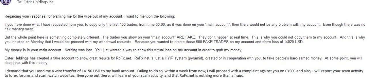 Rofx.net is a scam. They are cooperating with Ester broker and every day they produce fake trades for previous day. As a proof, see attached report sent from Ester broker customer support. This is a supposed service offered from them, but has exactly the same trades with Rofx.net. They have offered to me, these trades to be copied on my MT4 account. All I had to do is deposit $14,000 to that account. As soon as I did so, I have asked to start copying these trades on my account.