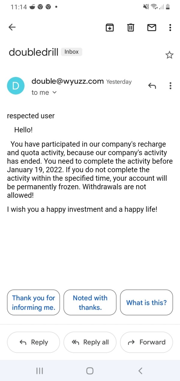 Did a few trades with double drill limited and they signed me up to a rewards program without my permission all i did was ask for information on it than the next thing i know their threating to freeze my account unless pay 10000 usd. They have 2000 usd from me. I took screen shots of email they sent me and their customer service message.