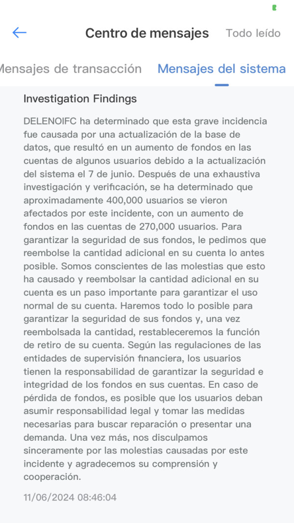 En este momento DELENO IFC no está permitiendo retirar el saldo de las cuentas supuestamente por un error de actualización y por dicha razón ya no te permite retirar a menos que deposites más cantidad de dinero según ellos es un total fraude y muchísimos usuarios han salido perjudicados con esto lo cual indica que DELENO va a desaparecer y en este momento ya no está en funcionamiento, nadie te da respuesta de absolutamente nada y según la licencia de regulación tenías un monto de reembolso de hasta 2.000 USDT lo cual es falso porque en este momento nadie te da respuesta sobre el dinero