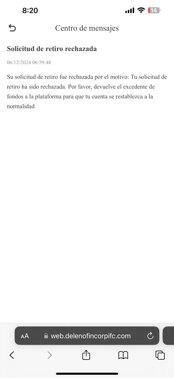 Buenas tardes, desde el día de ayer quise hacer un retiro en la plataforma Deleno y no fue aprobado, según ellos por una actualización donde el dinero que yo tenía se duplicó y debo devolver el excedente, pero no dicen donde se debe de devolver. Y es la razón donde ellos se sostienen para no dejar retirar a ningún usuario, no creo que sea lo correcto que nieguen a usar mi dinero, por un error que ellos mismos crearon.