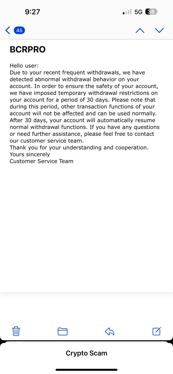 i start investing on bcrpro after my amount reach a certain amount of 6114$ after i couldn’t abale to withdrawal the my fund they refused to withdrawal my fund and they mail me my account is restricted for 30days they don’t want to take my amount they are totally scammer be aware