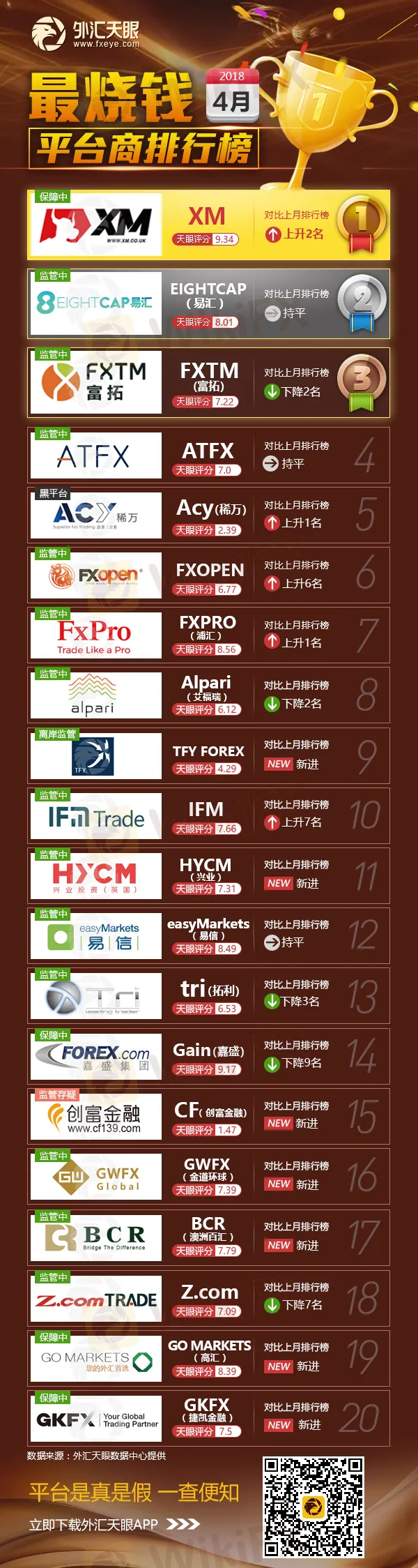 从榜单排名可以看出在进入4月份以来,外汇市场投入额变化处于上升趋势,4月份XM对比3月份(上升2名)摘得排名第一名。EIGHTCAP(易汇)相对稳定持平,FXTM(富拓)相对3月份(下降2名)。