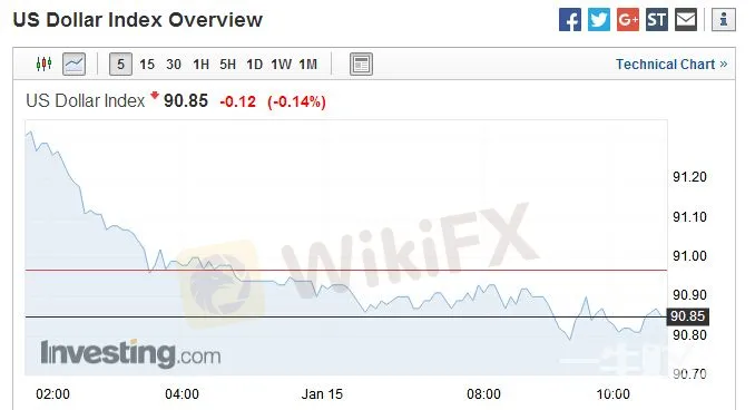 据一牛财经的数据,截至北京时间11:00,美元指数报90.85,下跌0.14%,稍早一度触及90.77,创2015年1月来新低。