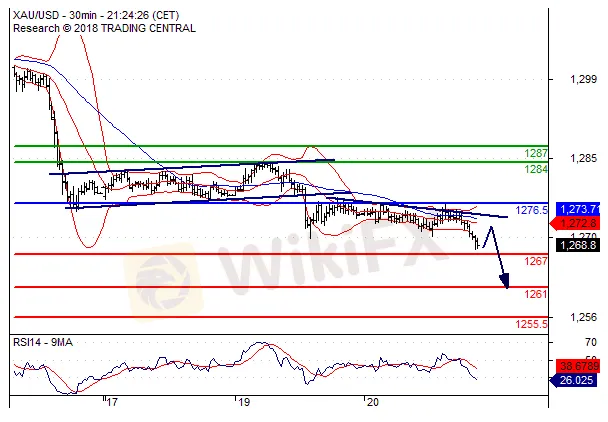【Trading Central技术分析】6月21日黄金 当日内: 被下降趋势线拖累