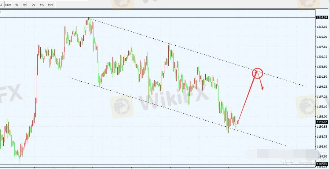 狙击战法系统一:4小时空头趋势,逢高做空为主。1小时形态构建中,逢高做空。30分钟下降通道运行,今日上轨的压力在1203附近,反弹出看跌吞没形态做空,止损形态之外加1美金,持仓暂定为3个小时。