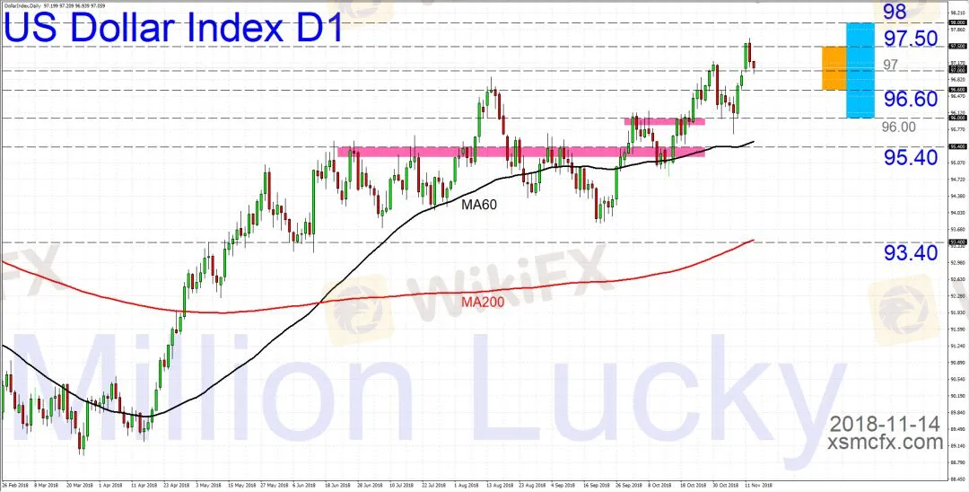 (下图) 美元指数 昨日大幅回落,今日可能区间96.6-97.5。