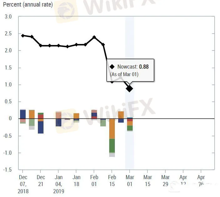 纽约联储GDP Nowcast模型的预测也有明显下调。该行3月1日发布的最新预测显示,对一季度的GDP增长预期,从上周的1.2%,降低到了0.88%。而在2月1日,这一预期一度高达2.39%。