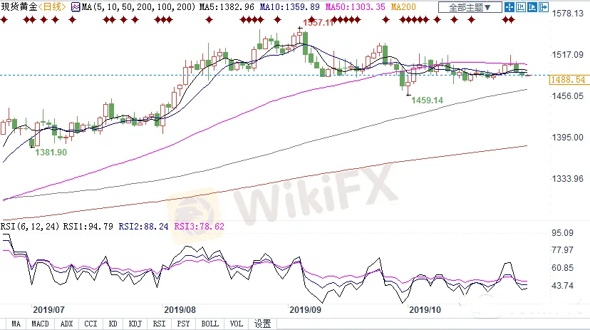 10月29日,现货黄金连续两个交易日下滑,最后收跌0.32%,报1487.72美元/盎司。10月30日亚市早盘,现货黄金维持疲软态势。 人们普遍预计美联储这次将降息25个基点,目前CME的美联储观察工具显示,美联储周四降息的概率高达97.3%,该数据高于昨天预测的95.1%,也高于上周预测的94.1%。目前市场已经基本消化美联储的降息预期。澳大利亚国民银行经济学家莎玛(John Sharma)表示,市场所有目光都聚焦在本周的美联储会议上,投资者们真正关心的是美联储是否会给出今年余下时间持续鸽派的信号。黄金分析师瓦格纳表示,投资者和分析师将关注美联储此次声明的两大要点和主席鲍威尔的评论。第一个也是最重要的要点是,美联储官员是否投票决定降息。第二,他们将寻找美联储计划中当前货币政策和刺激措施的迹象。此外,投资者将更关注国际贸易局势的发展情况。他认为,这三个基本面因素将深刻影响,并塑造未来避险资产的市场情绪。 10月29日,另外一名黄金分析师刘易斯(Christopher Lewis)指出,美联储的利率决定当然很重要,但更重要的是声明的整体基调。如果市场继续认为,美联储政策非常宽松和稳健,那么很可能继续看到市场对贵金属的需求。当然,人们首先想到的是黄金。总的来说,金价看起来要上涨,尽管最近表现平平。 刘易斯认为金价未来很可能继续上涨,不仅仅是因为美联储降息,还因为全球地缘政治局势可能再次令人感到担忧。此外,丹斯克银行预计,美国10月季调后非农就业人口仅增加5万人。疲软的非农数据可能增强美联储未来降息预期,从而提振金价,投资者对此也需保持关注。