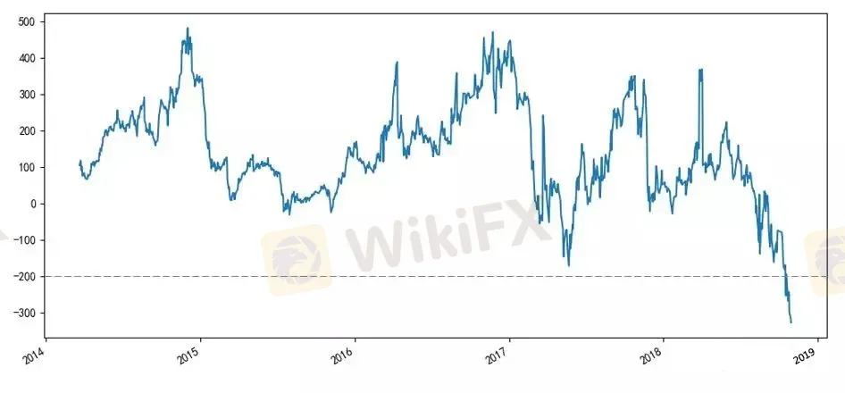 上图展示了使用热卷和螺纹钢的主力合约计算的卷螺差的时间序列。在进入2018年10月下旬之前,卷螺差的历史极值从未突破过 -200。以此来构建策略的话,我们会在卷螺差到达 -200 时做多热卷、做空螺纹。不幸的是,在2018年10月下旬,卷螺差持续突破历史下限,而上述的套利交易也只能持续亏损。当我们过度依赖历史极值这个“锚”的时候,就会忽视其他的因素——这两种商品各自的库存、钢厂的生产情况、需求端的区别等。忽视这些因素将会造成非最优的判断,策略亏损也就在情理之中了。