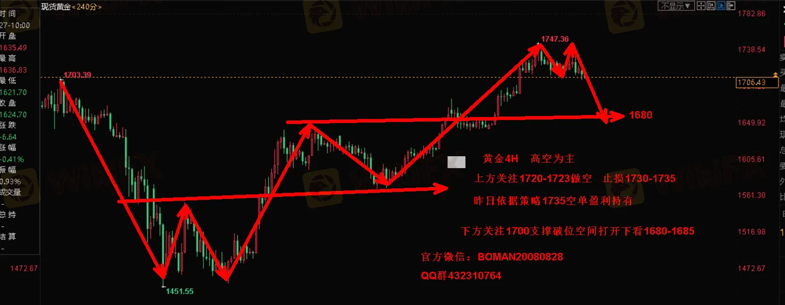 黄金1735中线空单盈利持有 原油反弹继续做空