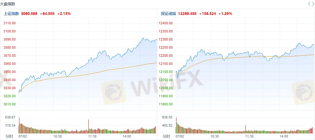 A股三大指数今日集体收涨,其中沪指大涨2.13%,逼近3100点整数关口,收报3090.57点;深成指上涨1.29%,收报12269.49点;创业板指小幅收涨0.20%,收报2424.39点。市场成交量继续放大,两市合计成交上万亿元,达到10800亿。行业板块呈现普涨态势,券商股掀起涨停潮。北向资金今日净流入195.90亿元。