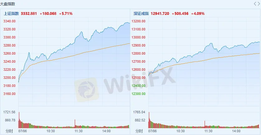 指数全天高歌猛进沪指暴涨近6% A股总市值创5年记录。沪指早盘高开1%后一分钟内上攻至3200点关口,随后再度拉升涨超2%,深成指涨超1%,而创业板表现较为弱势。沪深300指数涨2.7%,创5年来新高。从盘面上看,券商、银行、地产、免税、中芯国际概念、保险居板块涨幅榜前列。