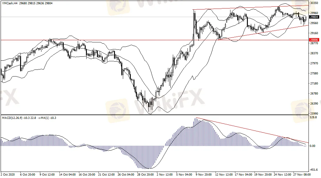 道指大形态看出现走势与MACD指标高位背离迹象,不过好在道指的下方上升通道支撑依旧有效,所以目前不能得出道指要大幅回调的结论。当前道指是30000点附近投资人做多意愿不坚决,但是在低位29500点附近又是不舍得离场,所以短期道指形态将继续振荡,投资人要注意的是12月美国将开始大规模接种疫苗,如此消息不能令道指突破前期高点30200的话,道指后市将大概率会向下进一步测试支撑,如29500破位则看28880附近。