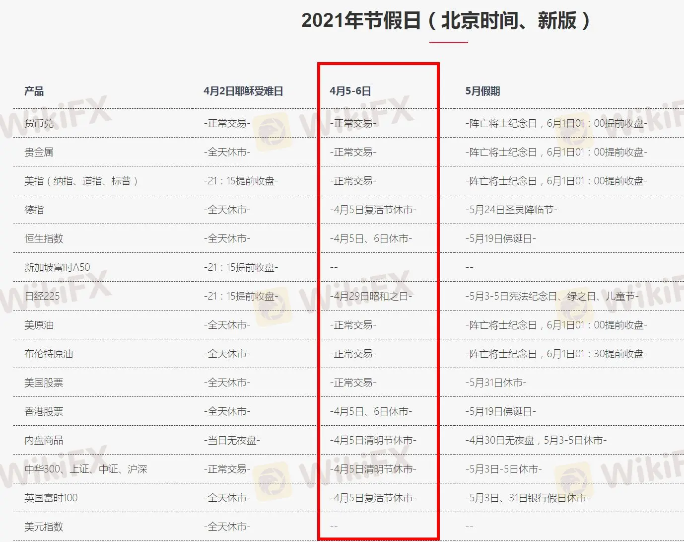 由于2021年4月2日(周五)为耶稣受难日,至4月5日(周一)为复活节和清明节假期,故我司MT4平台部分产品的交易时间将作出调整,具体调整时间如下(北京时间):