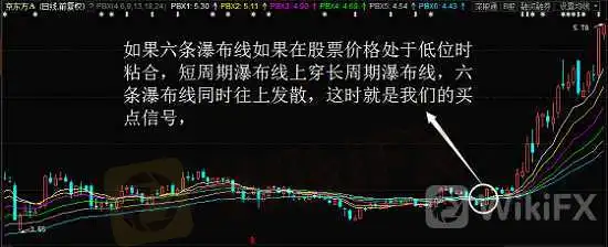 如果六条瀑布线如果在股票价格处于低位时粘合,短周期瀑布线上穿长周期瀑布线,六条瀑布线同时往上发散,这时就是我们的买点信号,如上图京东方A(000725)。