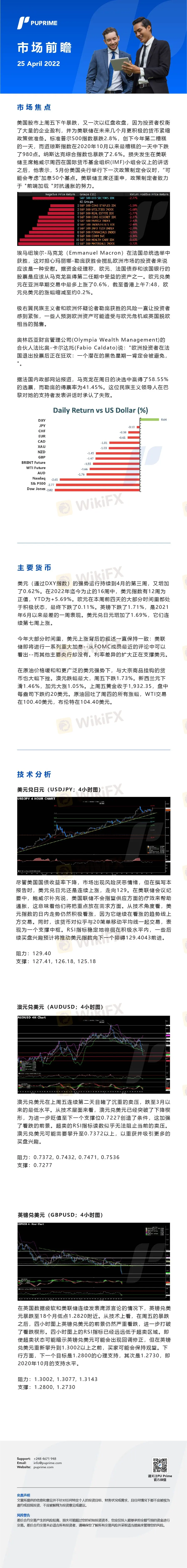 美国股市上周五下午暴跌,又一次以红盘收盘,因为投资者权衡了大量的企业盈利,并为美联储在未来几个月更积极的货币紧缩政策做准备。美元(DXY指数)的强势运行持续到4月的第三周,又增加了0.62%。在原油价格缓和和更广泛的美元强势下,与大宗商品挂钩的货币也大幅下挫。【更多市场动向,请登陆PU Prime官网-技术分析】