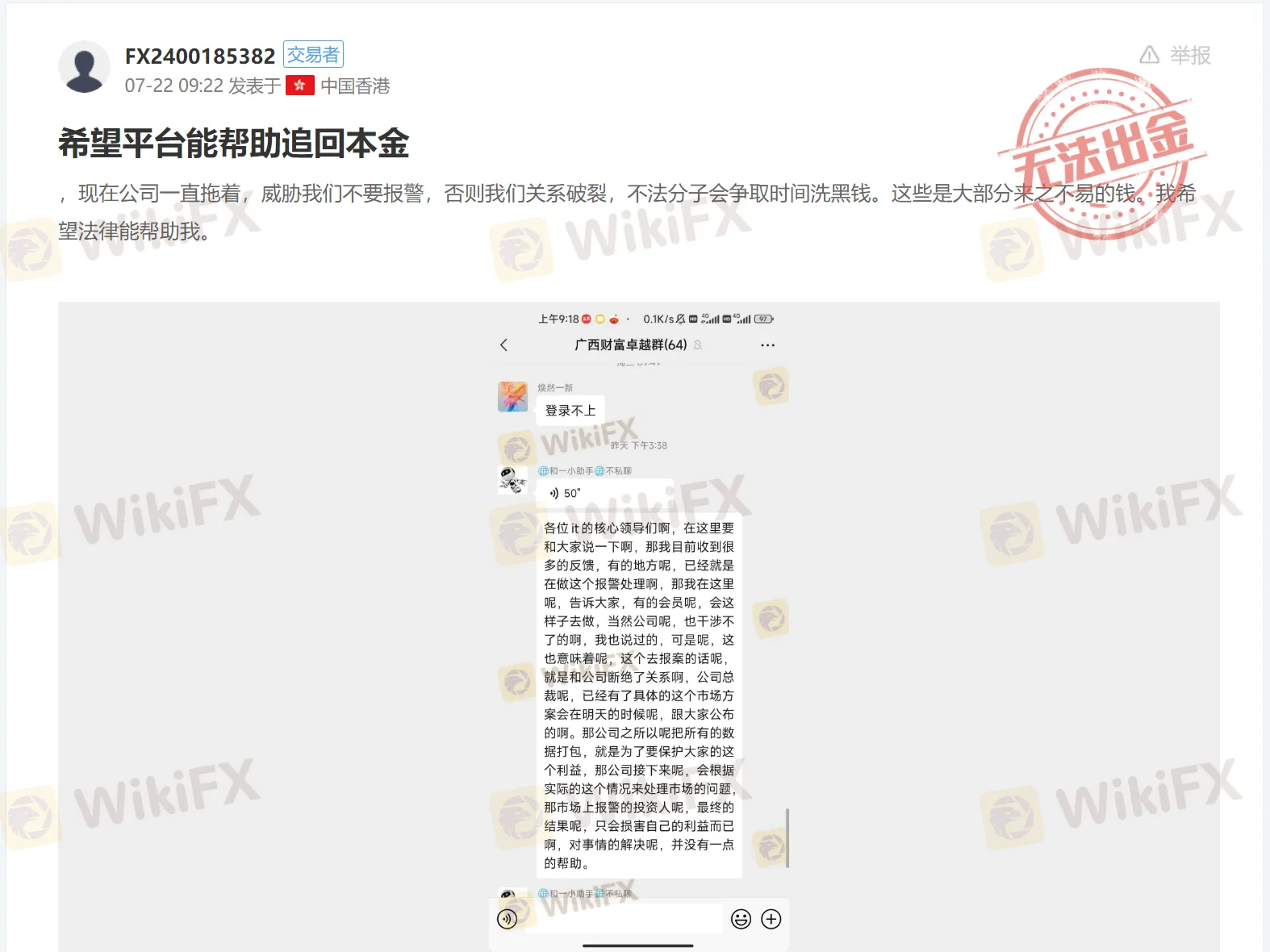 前段时间,有汇友向外汇天眼爆料,在ITGFX 进行外汇交易后,账户迟迟无法出金,其业务部门的房总随之在微信交流群中发布重要通知,并告诉群友,ITGFX也不遇到这种事情,但因不法分子的非法行为,公司将全力解决账户无法出金的事宜。该汇友讲述,房总称ITGFX总裁将亲自宣布解决方案,但同时业务部门的房总也警告,如果有人投资者站在公司的对立面,ITGFX 将把该投资人的数据清除。另外,汇友还指出,ITGFX客服还公开威胁群里的投资人,表示如果选择报警,不会有丝毫帮助,仅仅只会损害投资人自己的利益。