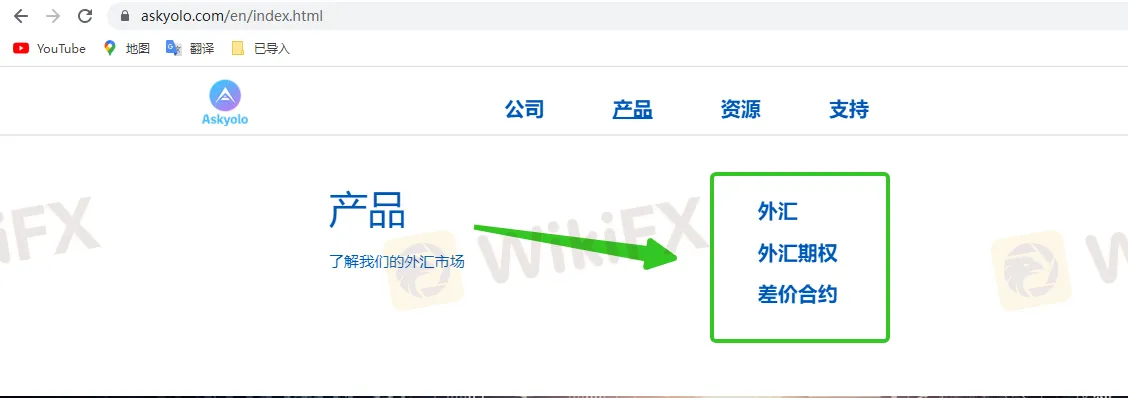 进入Askyolo Tech公司官网可以发现,公司产品包括外汇、外汇期权和差价合约。交易超过 80 种交叉货币,包括主要、次要和新兴货币。有竞争力的点差和低保证金率(没有隐藏的佣金或交易费用)。