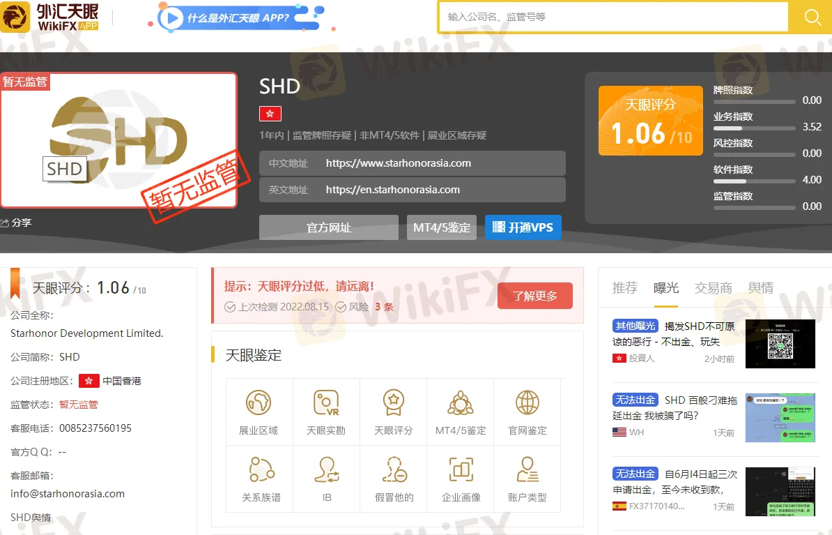 最近有相当多输了的投资者向我们外汇天眼平台反应SHD的问题,称其客服的电话长期不通,另外扫描QRcode 加了客服经理完全不回覆,此外,网上的地址并不是SHD 的运作地址,而是一家公司秘书的店舖!很多其他公司也以这个地址来注册!所以有理由怀疑SHD 利用第三方的身份进行不可告人的交易,投资失利後便拒绝出金,行为令人发指!现在用什麽方法也找不到负责人!
