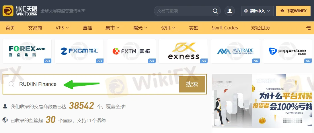 以投资者咨询的RUIXIN FINANCE为例,只需要在外汇天眼(https://www.wikifx.com/zh-cn/)首页搜索栏输入对应的交易商信息如——RUIXIN FINANCE。