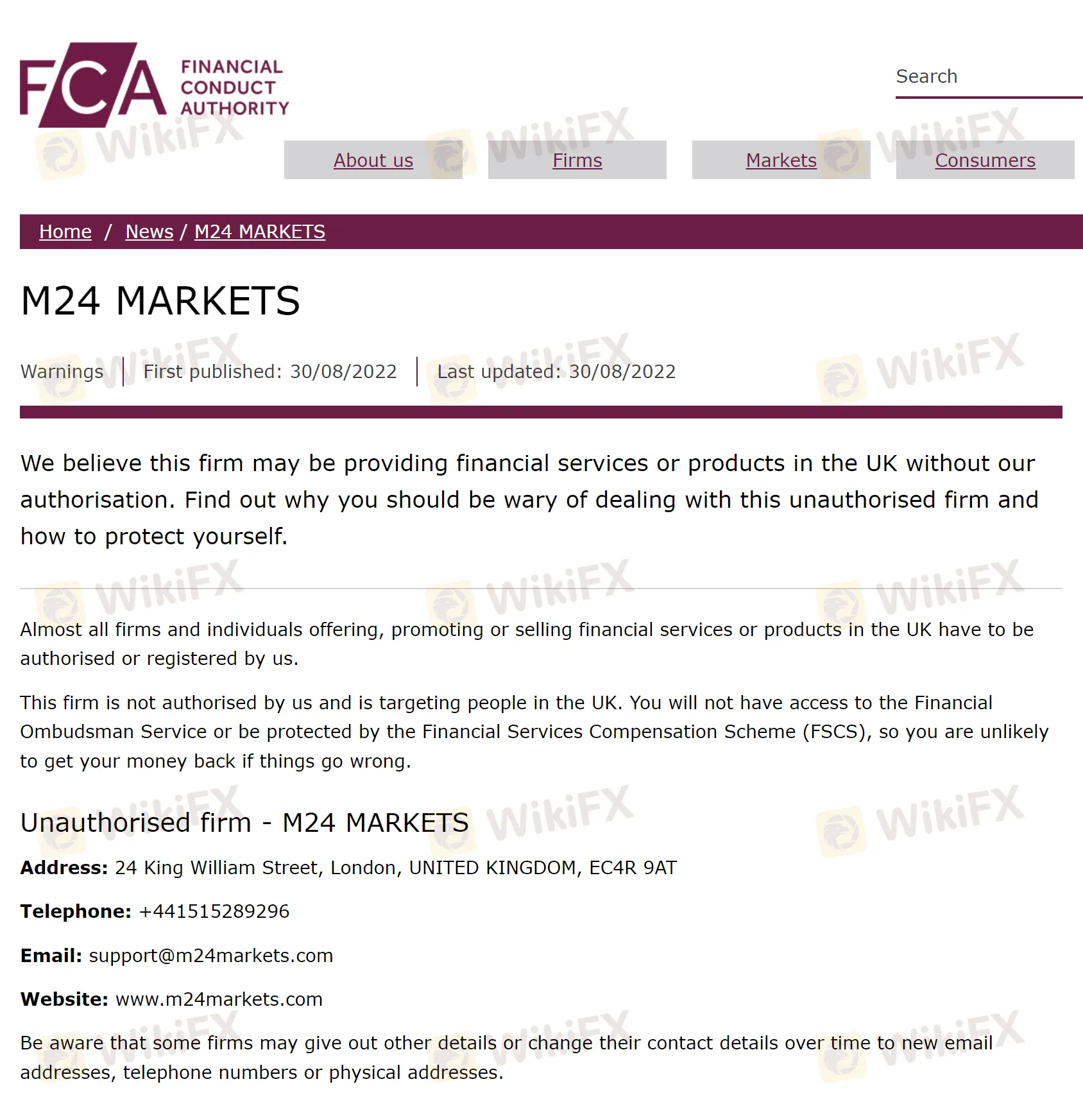 在警告中,FCA还公布了未经授权的公司——M24 MARKETS的相关信息,包括地址、电话、电子邮件和网址(www.m24markets.com)。同时需要警惕,随着时间的推移,该公司可能会更改新的信息包括电子邮件地址、电话号码或实际地址等。