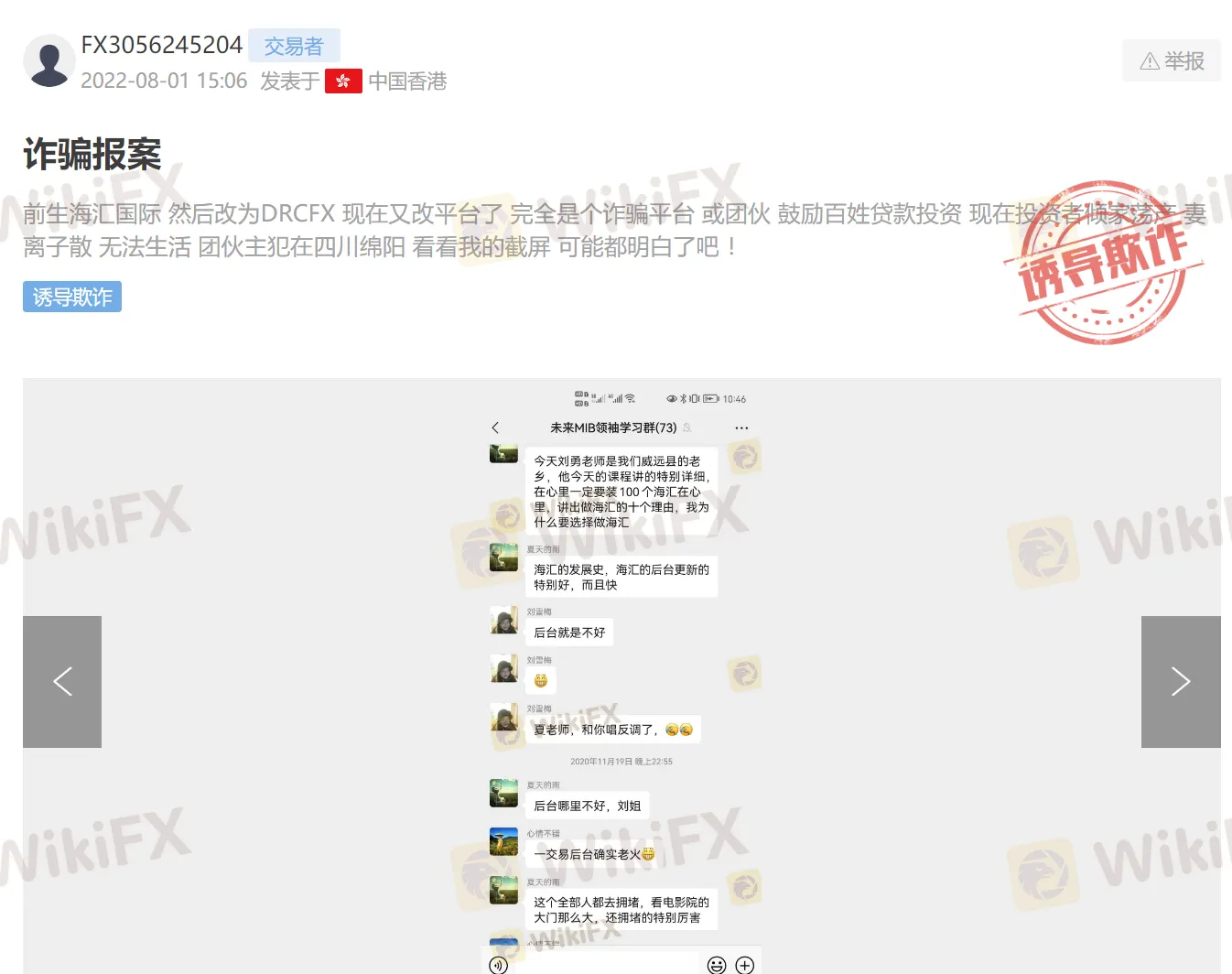 近日,外汇天眼收到来自原海汇国际的内部员工的爆料。该爆料称,原“海汇国际 ”实控人又搭建了一个交易平台,现已更名为“DRCFX”,这个平台是一个彻彻底底的诈骗平台。搭建平台的这一团伙鼓励百姓贷款投资,让受害者倾家荡产、妻离子散,以至于难以生活。爆料者讲述,这伙人在一个名为“未来MIB领袖学习群”交流经验,以骗更多DRCFX用户入坑!