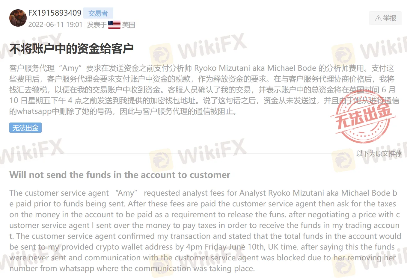 前段时间,一位来自美国的汇友向外汇天眼求助称,在SAEN平台交易准备提现时,SAEN客户服务代理“Amy”要求其在提现之前先支付分析师 Ryoko Mizutani aka Michael Bode 的费用。该汇友讲述,在支付这些费用后,SAEN平台客服代理告知想要提款,需再缴纳资金的税款。由于汇友想尽快出金,在与客户服务代理协商后,便按要求缴纳了相应的金额。随后,SAEN客服人员确认了汇友的缴款,并表示账户中的总资金将在英国时间 6 月 10 日星期五下午 4 点之前到达她的账户。然而,令其感到意外的是,资金从未发送过。
