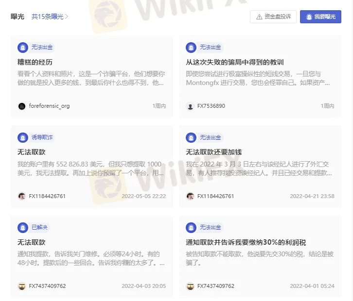 近期,有众多投资者在外汇天眼的曝光区域曝光MOTONGFX平台存在无法出金等问题!截止目前已有15条曝光帖,并且呈现不断增长趋势,这也意味着MOTONGFX平台问题日益严重。