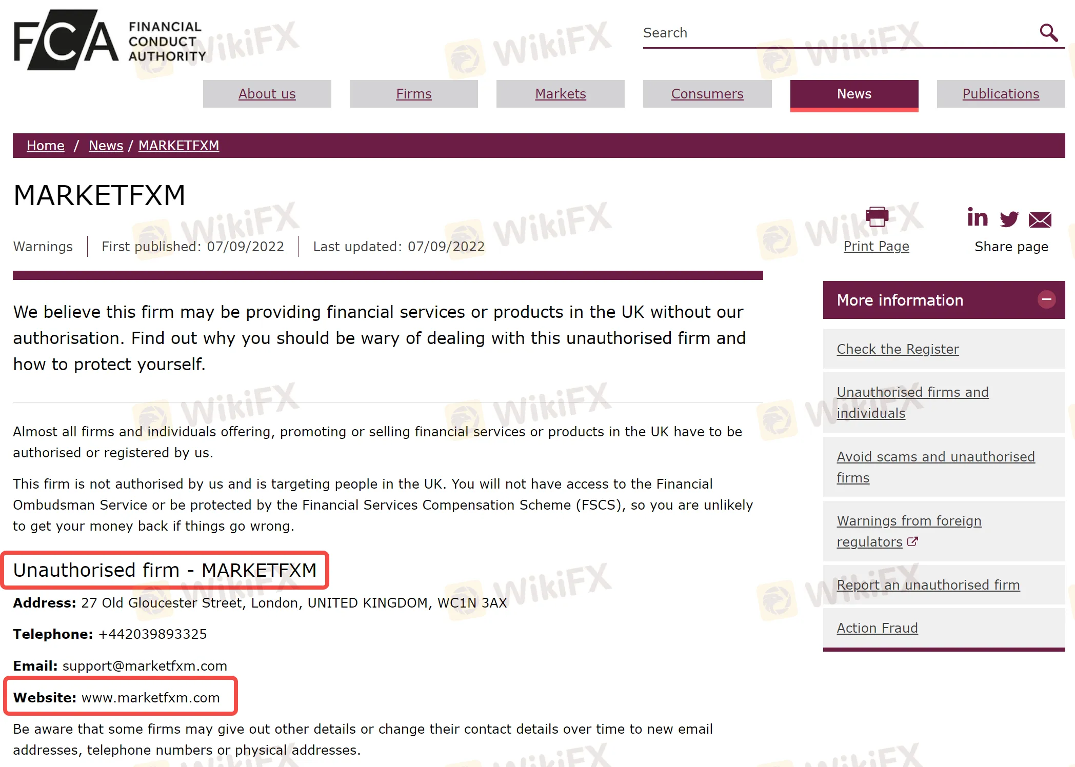 几乎所有在英国提供、推广或销售金融服务或产品的公司和个人都必须得到FCA的授权或注册,但是这家公司未经FCA授权。这意味着投资者将无法使用金融申诉专员服务或受到金融服务补偿计划 (FSCS) 的保护。此外FCA还公布了MARKETFXM相关信息如下: